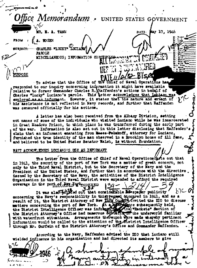 - Report by Federal Bureau of Investigation contains speculation that the Naval Intelligence program aided Luciano in having "unofficial visits with individuals who probably would not have been admitted as visitors under the ordinary rules." Report also criticizes the "extremely careless" handling of visiting records. (FBI July 1946)