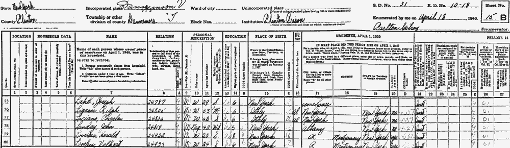 - "US Census 1940" - United States Census of 1940, New York State, Clinton County, Dannemora Township, Enumeration District 10-18, Sheet No. 15B, Line 77.