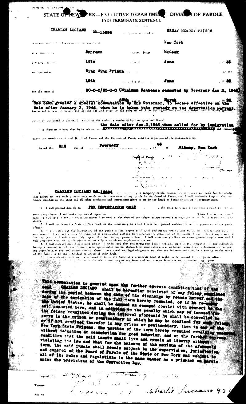 - Governor Thomas E. Dewey commutes Lucania's sentence "upon the express condition that the said Charles Luciano be deported forthwith and shall not thereafter re-enter the United States. (Parole, Herlands)