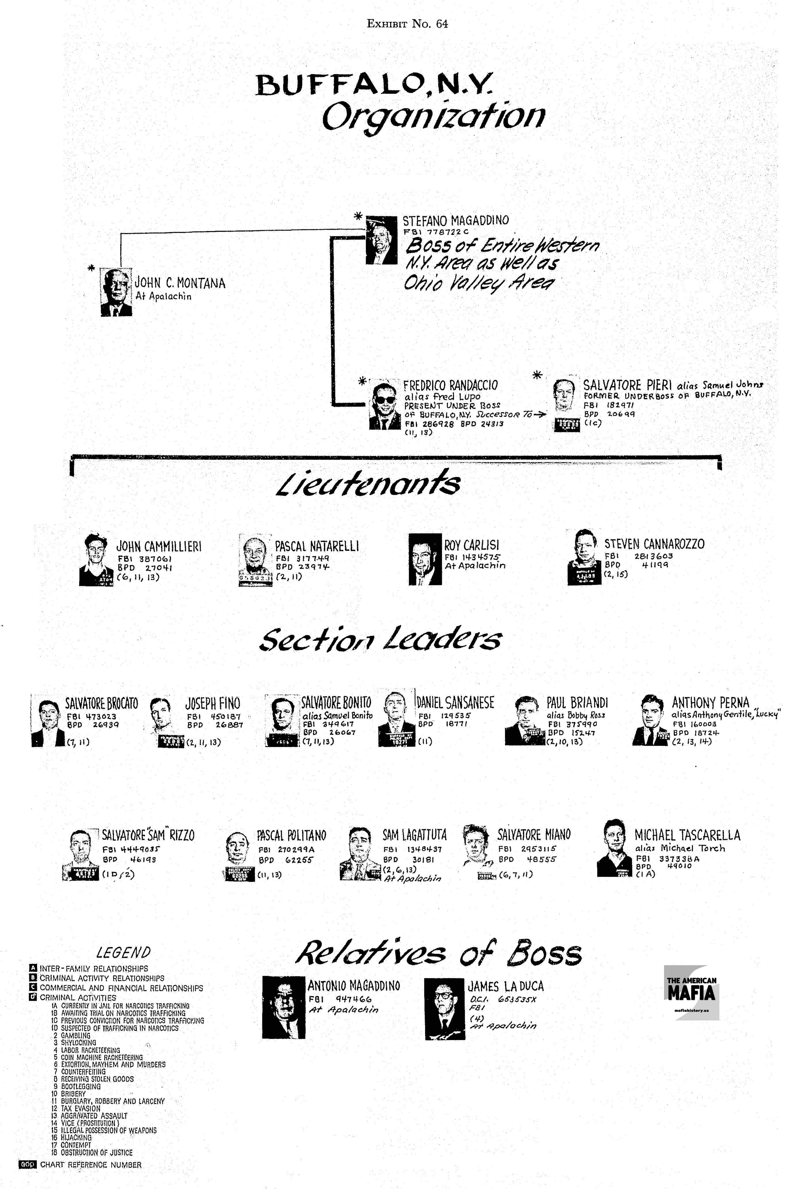 1964 - John Montana, Magaddino underboss with great influence in the Buffalo area, died. In the same year, the relationship between the Magaddino Family and the long allied Bonanno Crime Family of Brooklyn broke down.