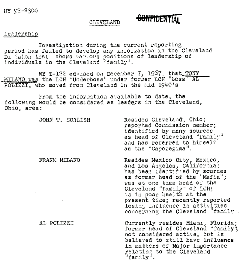1946 - John Scalish (Born Cleveland, OH, Sept. 18, 1912. Died Cleveland, OH, May 26, 1976.) Scalish gradually took over for Polizzi, who withdrew to Florida but continued to take part in Cleveland rackets. For a time, Scalish served in an acting boss role. He appears to have been accepted as Cleveland's full boss by about 1949. Scalish (Scalise) is believed to have made his early fortune through a regional monopoly on cigarette vending machines. His Buckeye Cigaret firm, including John Scalish's brother Sam, Milton Rockman and Frank Embrescia, was exposed in 1954 testimony before a Congressional subcommittee. Scalish's reign was one of stability for the Cleveland underworld. Under his leadership, the organization moved aggressively westward into Las Vegas and California. Scalish worked with leaders in the Chicago Outfit and the Detroit Partnership to devise 1960s "skimming" operations in the Desert Inn, Stardust, New Frontier and Silver Slipper casinos in Las Vegas. Despite the new rackets, the Cleveland Mafia declined in numbers during Scalish's administration. Like his predecessor Alfred Polizzi, Scalish was opposed to recruiting new Mafia members.