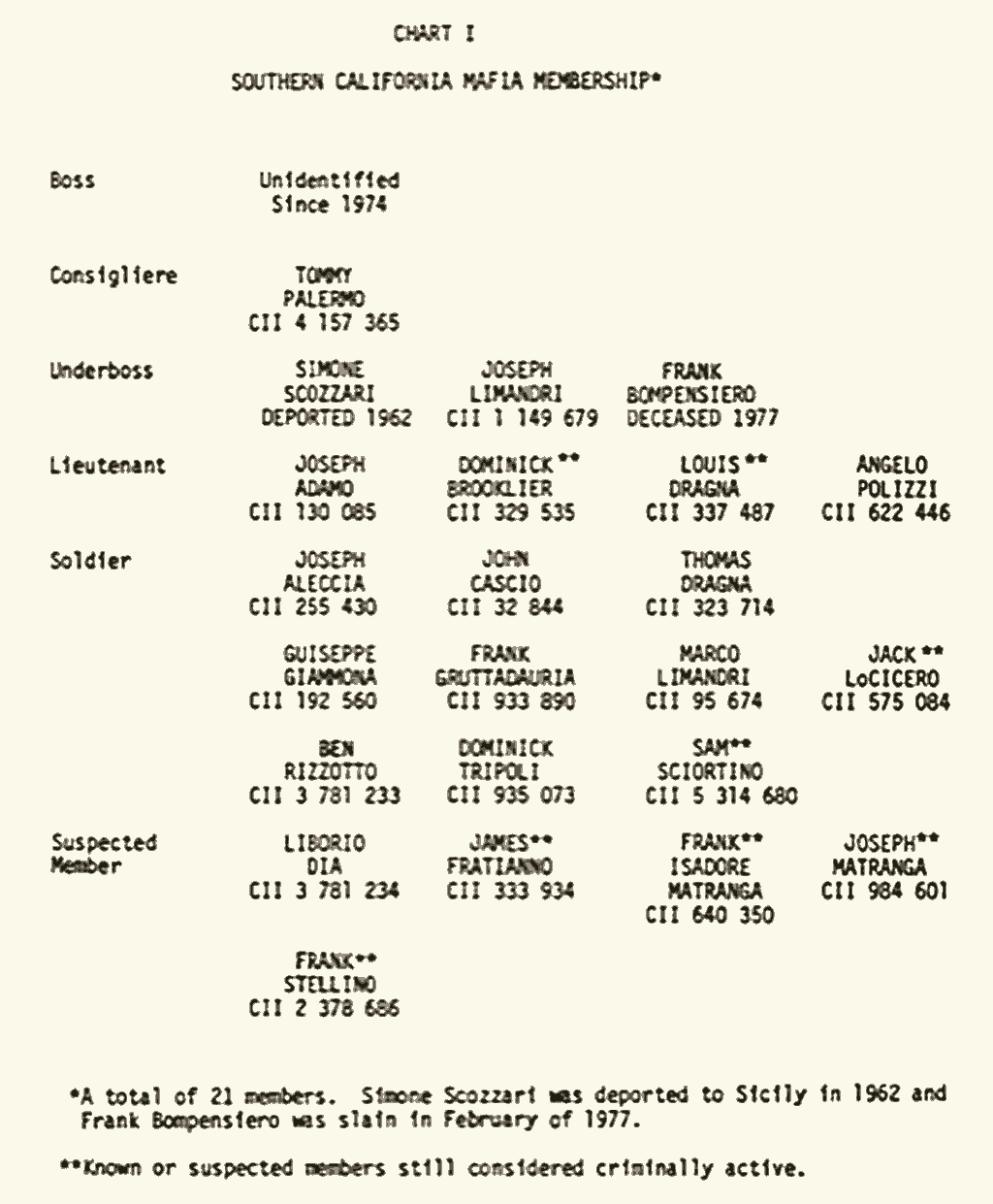 1974 - Dominic Brucceleri (1914 to 18 July 1984). Also known as Dominic Brooklier and as Jimmy Regace. Brucceleri joined the Dragna mob around 1947 after moving west with a fellow Midwest gangster. His California career began badly, as it seems he was responsible for some of the botched attempts on the life of Mickey Cohen. Brucceleri took over the boss role after the death of Nick Licata.