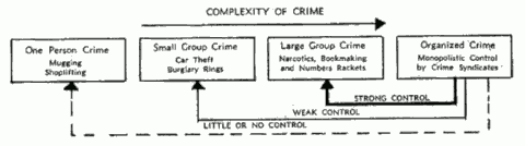 Professor Donald Cressey, a consultant to the President's Crime Commission, offers the conception of criminal activity as a continuum beginning with crimes by single individuals and moving to those planned and executed by small groups.[3] As we proceed along the continuum, the number of individuals, the types of crime, and the complexity of planning increase. Near the point where planning and organization require several layers of authority and specialization,