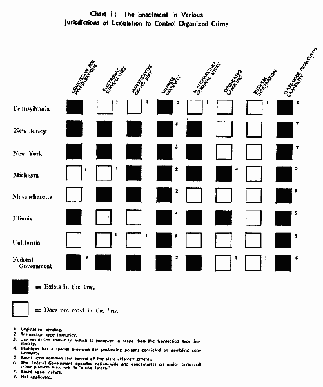 New laws are definitely needed to supply legal tools for combating modern organized crime, Chart 1 [* Pg. 7] demonstrates that Pennsylvania ranks substantially behind the Federal Government and behind other states with serious organized crime problems in enacting needed legislation. Despite the fact that legislation has been proposed or is pending in Pennsylvania, little movement toward passage currently exists.