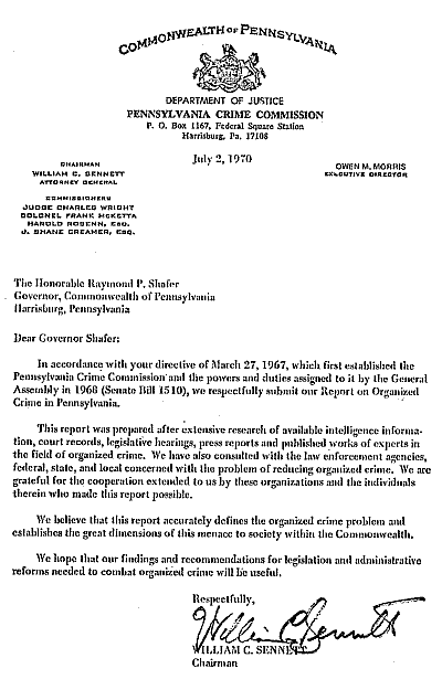 Following is the text of selected portions (we have omitted the "Strategies Against Organized Crime..." section) of the Pennsylvania Crime Commission's 1970 Report on Organized Crime. Pages in this web version have been numbered to correspond to the printed report. If errors are found on any of these pages, please contact us.